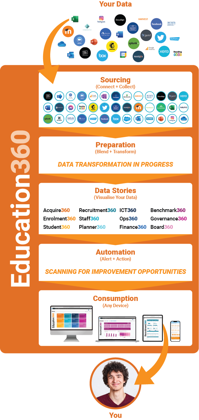 Education360 brings your school’s data together no matter where it lives, giving you a 360-degree view of your most important metrics, alerts to critical changes in performance, and surfacing actionable insights to assist you in the continued delivery of outstanding educational outcomes. With the combination of industry leading technology, capability, and methodology, Education360’s deep analytical and data-driven insights will help you unlock your schools’ full academic and business potential.