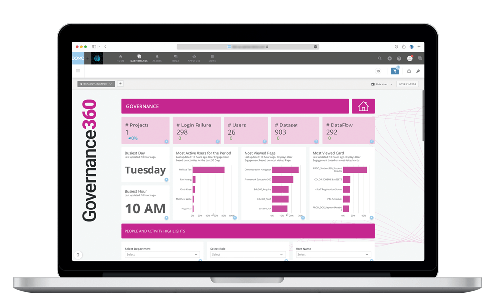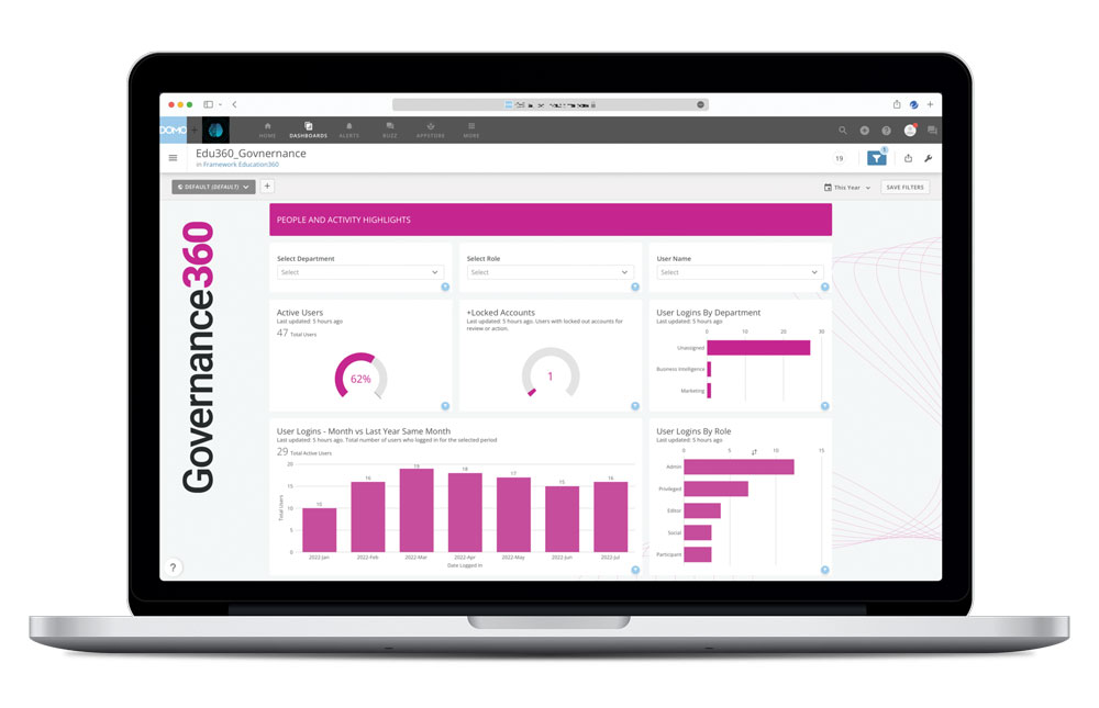 Governance360 gives you the freedom to explore how your team is using Education360. As Governance360 is powered by live datasets with no configuration, your team can easily build cards, alerts and workflows around the metrics you want to see as well as use the pre-built dashboards.
