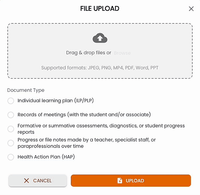 Evidence Uploads | Attach relevant documents such as lesson plans, meeting notes, medical reports, and learning support plans directly to student profiles |
