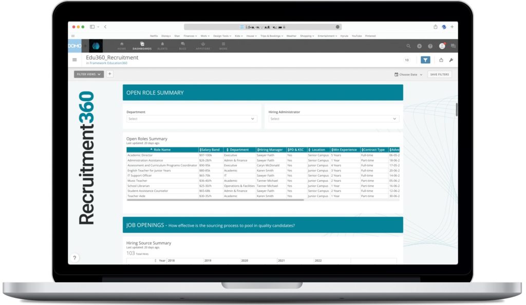 Recruitment360 helps HR managers visualise candidates currently in the recruiting pipeline as well as vacancies within the company that must be filled. By compiling all the information relating to an organisation’s recruitment in one place, HR recruitment dashboards streamline the recruiting and hiring process and help HR managers to achieve their goals.